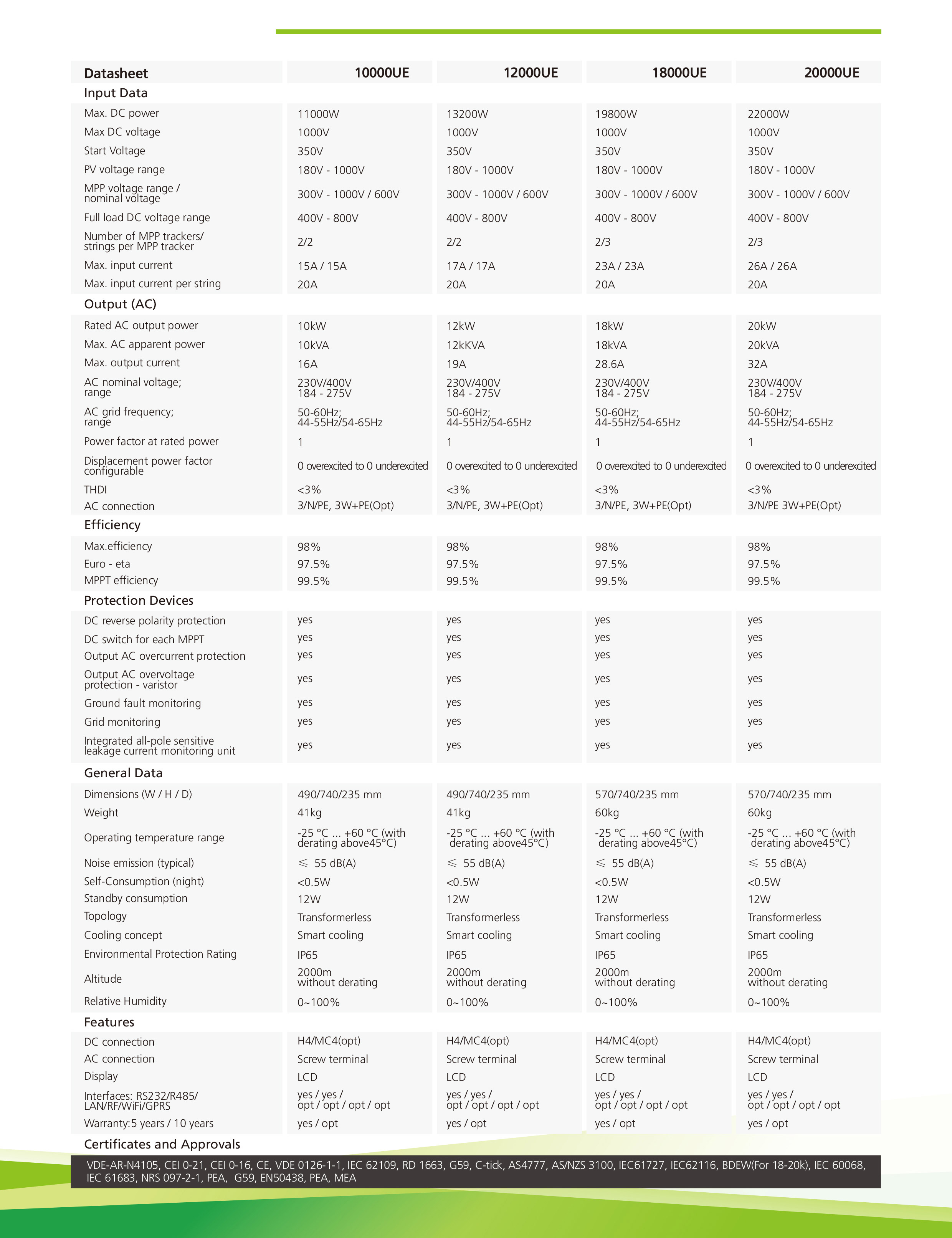 Tension d'entrée CC jusqu'à 1000 V, efficacité maximale de 98%, commutateur CC interne, sans transformateur, design compact, contrôleur Multi MPP, MTL - String, technologie Ethernet / RF / WiFi, contrôle du son, installation facile.